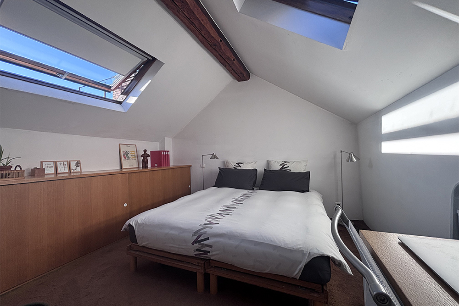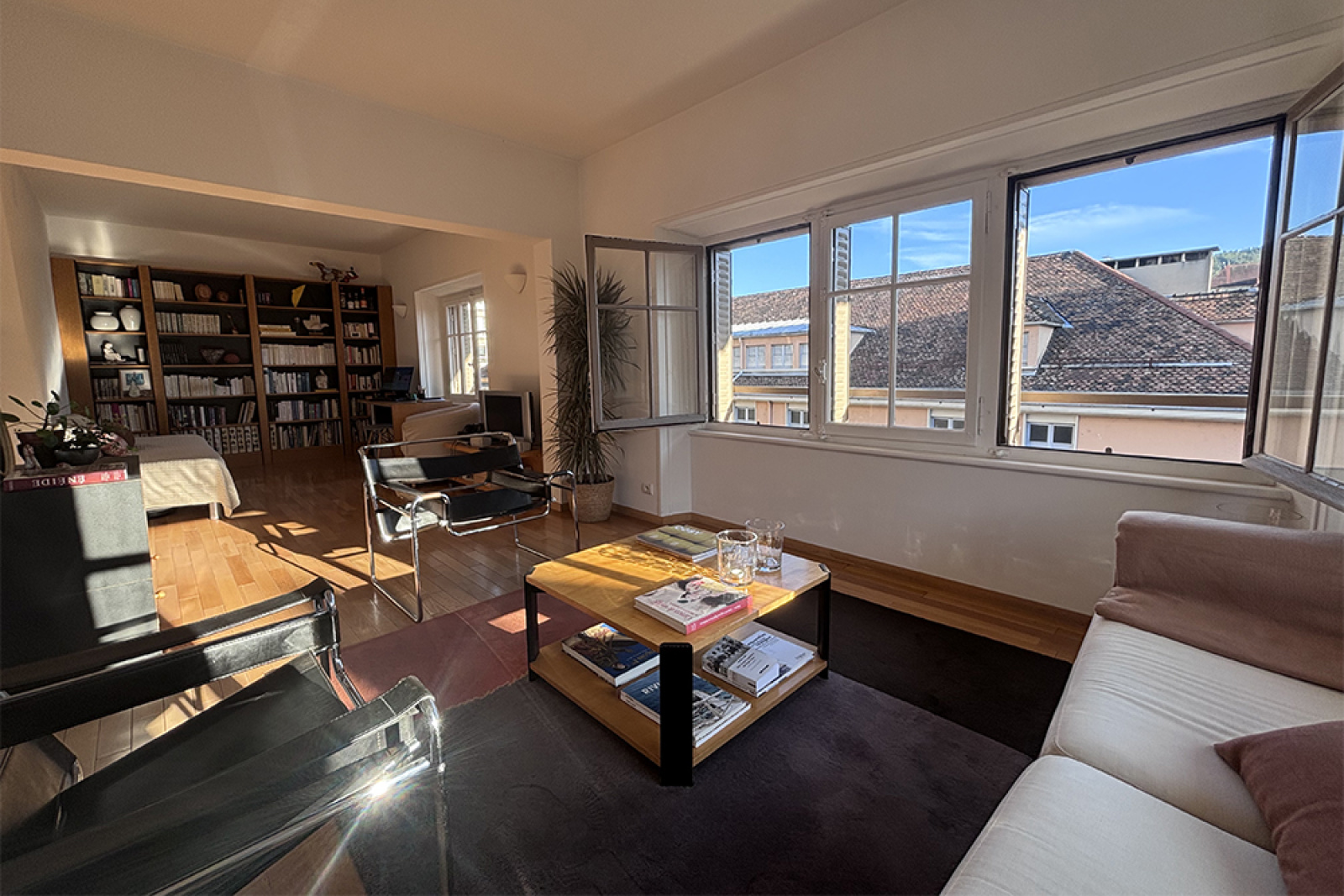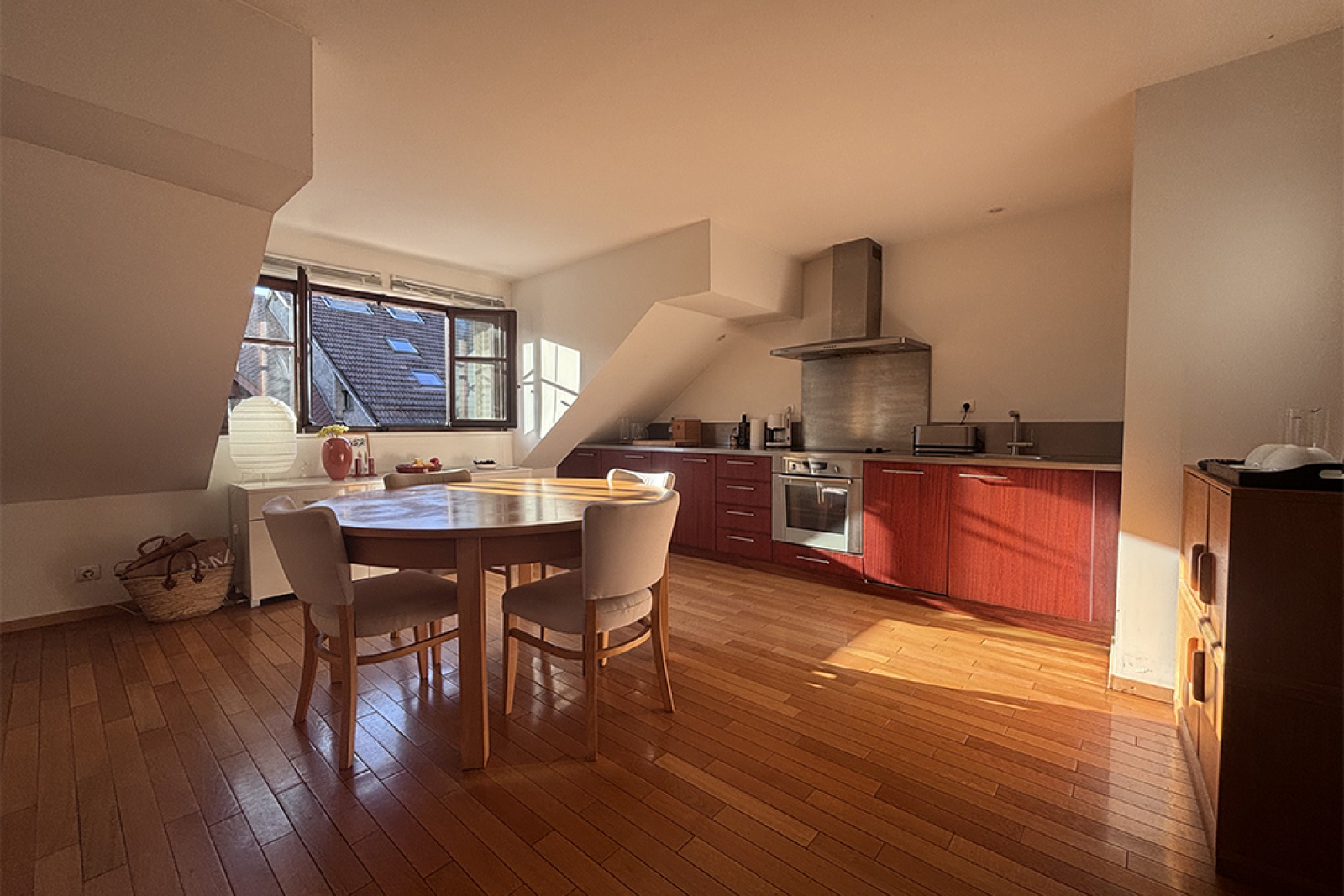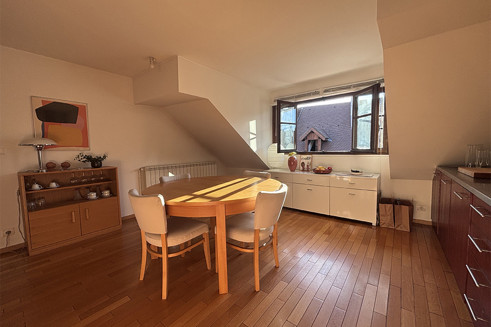 Quartier de la "rue du Lac" vaste appartement 2P de 62.33 m2 en dernier étage avec ascenseur d'un bel immeuble ancien comprenant : Un entrée, wc, salle d'eau, cuisine équipée avec coin repas, grande pièce de vie plain sud; En combles : Une chambre.
